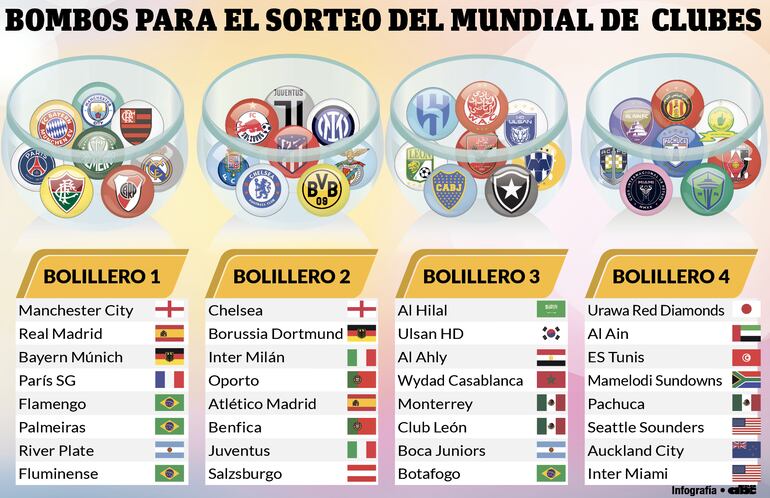 En esta nueva competición de 32 equipos que se celebrará entre el 15 de junio y el 14 de julio de 2025 en Estados Unidos, el bombo 1 queda completado con otros tres gigantes del fútbol europeo: Bayern Múnich, París Saint-Germain y Manchester City.