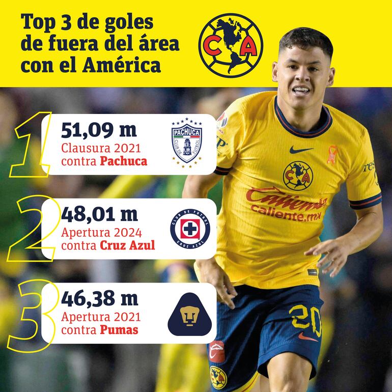 * Con América suma 17 goles y 23 asistencias en 198 partidos, entre todas las competiciones. Son 16 tantos en la Liga MX y 1 en la Liga de Concacaf.