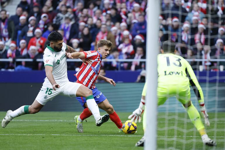 Aún así, le dio al Atlético para crear otras cuantas oportunidades. Una de Rodrigo de Paul, fuera. Otra de Giuliano, fuera también con un cabezazo a centro de un activo Galán. Y una más de Julián Alvarez, cuya primera conexión de verdad con Griezmann correspondió al minuto 40. Su tiro con la derecha fue demasiado flojo, fácil para el casi inédito David Soria.