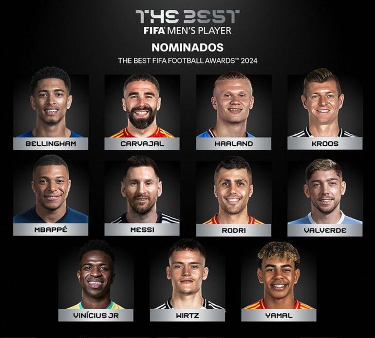 De los once nominados, más de la mitad son jugadores de Real Madrid (Carvajal, Valverde, Bellingham, Kroos y Vini, además de Mbappé, que jugó la primera parte de la temporada con París SG) y en la lista también están Lionel Messi, Lamine Yamal, Erling Haaland, Federico Valverde y Florian Wirtz.