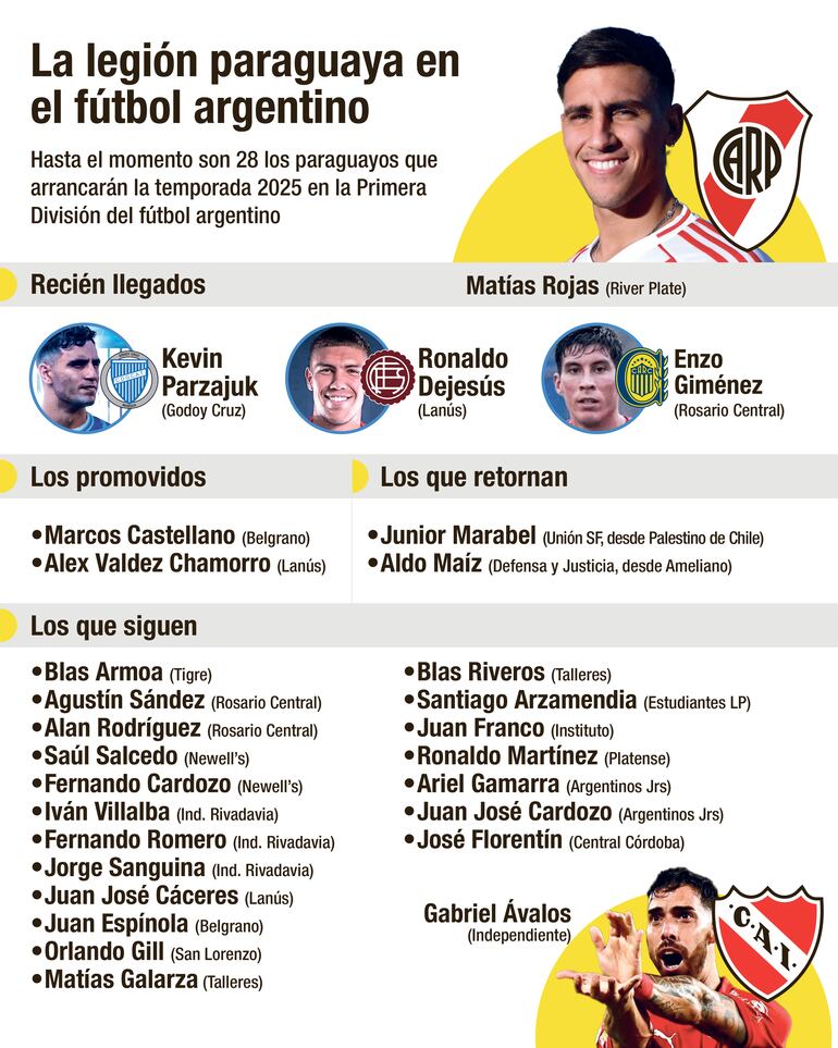 Ahora la nómina de jugadores en el campeonato de Primera División de Argnetin ase ha extendido a 28 (ver infografía) y podría ampliase. Es una muestra de que los clubes argentinos siguen confiando en la capacidad el futbolista guaraní, que siempre ha procurado destacarse en un exigente campeonato.
