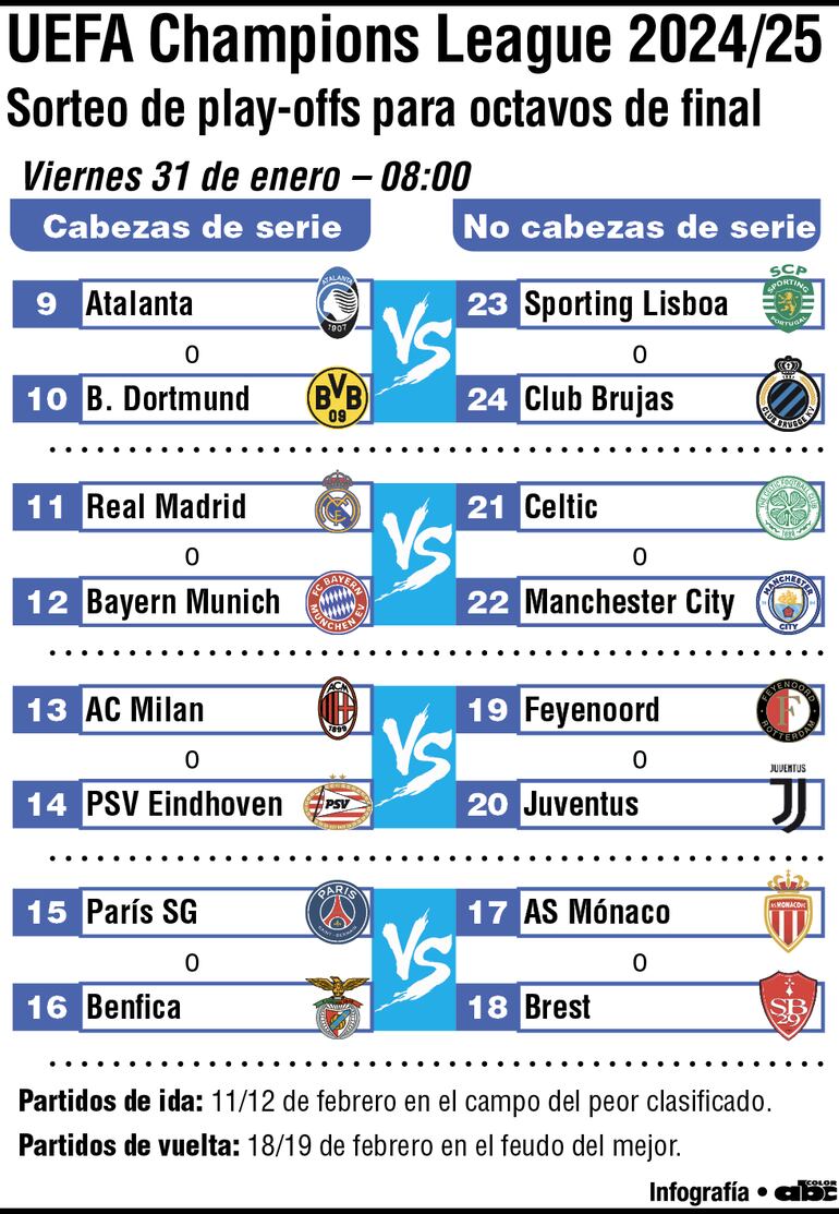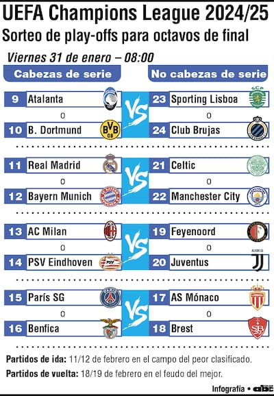 El fútbol europeo descubre esta temporada el sistema de la nueva Champions. Tras el final de la fase de grupos, con una jornada que incluyó todos los partidos en simultáneo lo que convirtió la clasificación en una montaña rusa, llega el momento de la repesca de los octavos.