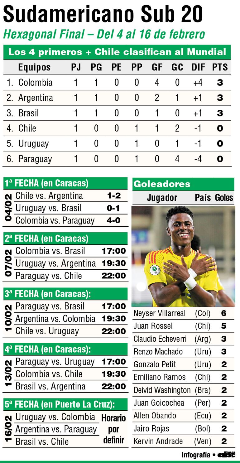 Brasil y Argentina abrieron el martes la fase final del Sudamericano Sub-20 con sendos triunfos ante Uruguay, 1-0, y Chile, 2-1, a la vez que Colombia arrolló 4-0 a Paraguay con tres goles de un imparable Neiser Villarreal.