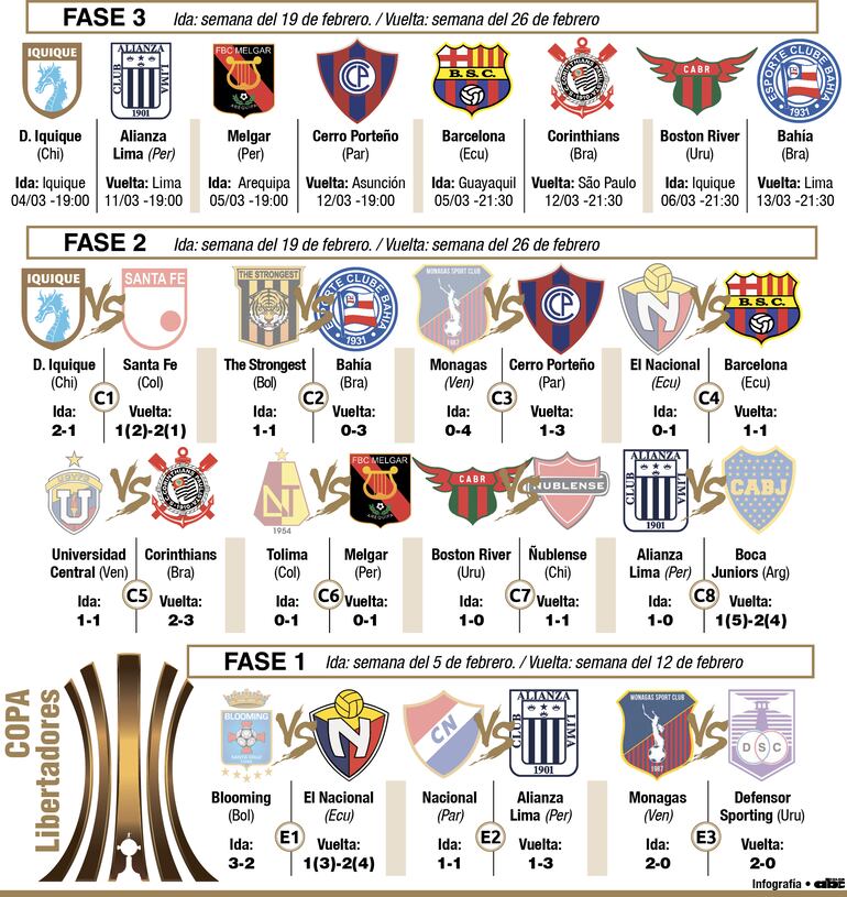 21:30 Barcelona vs. Corinthians, en el estadio Monumental de Guayaquil. Revancha, miércoles 12 en el Neo Química Arena, en São Paulo (21:30).