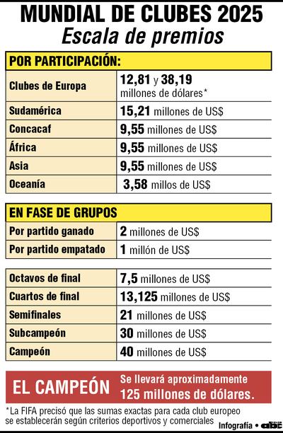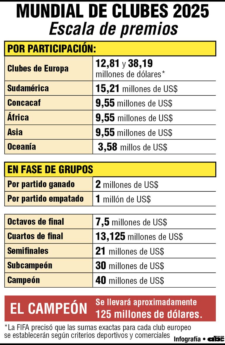 La FIFA, que ya había anunciado a principios de marzo una dotación global de mil millones de dólares para el nuevo formato del Mundial de Clubes, detalló la distribución de las sumas para los 32 equipos participantes: 475 millones de dólares se distribuirán por concepto de desempeño deportivo y 525 millones de dólares por participación.