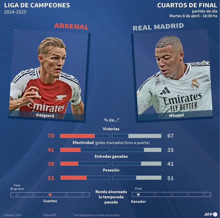Ida y vuelta en ocho días para conocer a los semifinalistas de la Liga de Campeones. El gran torneo de clubes europeos encara su recta final desde este martes: el Real Madrid, rey continental, choca contra el Arsenal en Londres y el Bayern Múnich recibe al Inter.