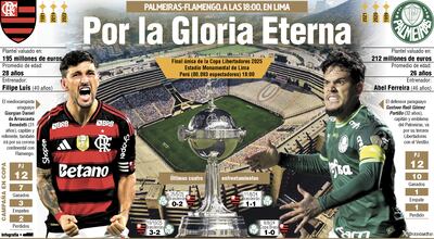El Fla aspira a un doblete: el equipo de Filipe Luís, el más popular de Brasil, roza el campeonato de la liga local con la punta de los dedos, con cinco puntos de ventaja sobre el Palmeiras y dos partidos por disputar.