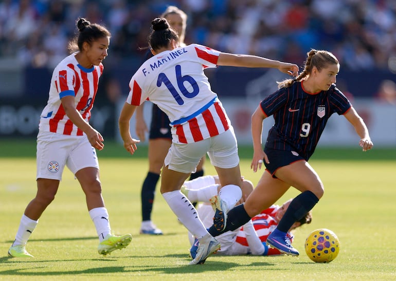 En la etapa inicial, las albirrojas pudieron aguantar los primeros embates del rival. Por derecha, Trinity Rodman, la principal estrella yanqui, fue una constante pesadilla para la zaga guaraní.