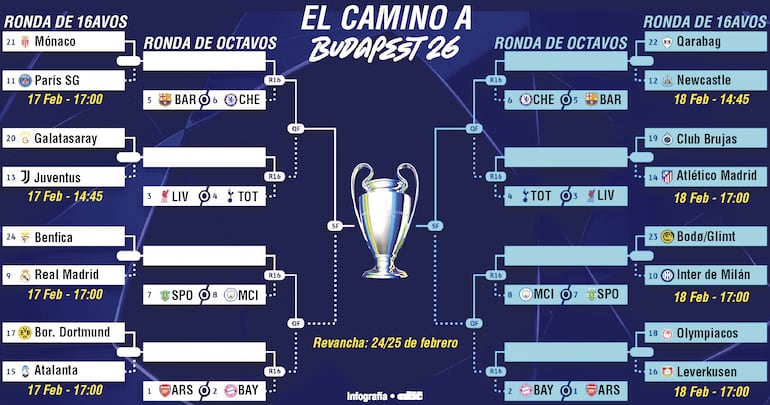 * Los 8 que ya esperan en octavos: Arsenal, Bayern Múnich, Liverpool, Tottenham, Barcelona, Chelsea, Sporting Lisboa y Manchester City.