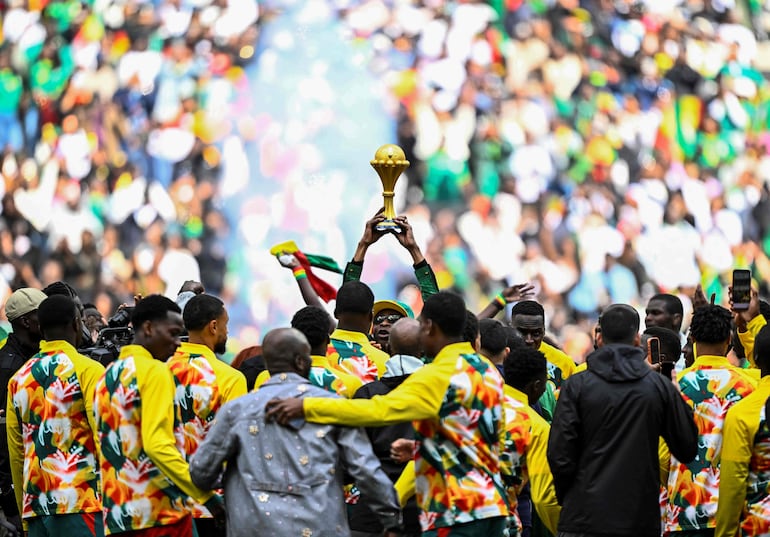 El capitán senegalés Kalidou Koulibaly, con el trofeo en los brazos, saltó al césped del estadio de Francia seguido de todos sus compañeros durante una actuación musical del artista Youssou N’Dour.