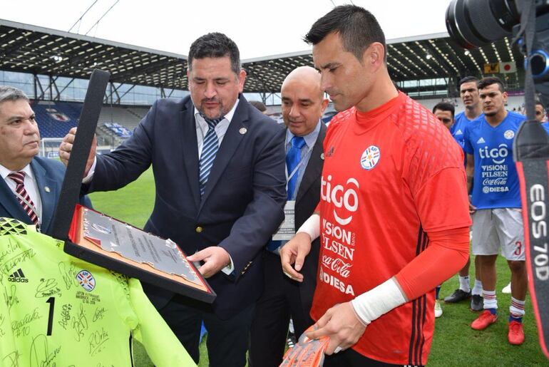 Antes del inicio del juego, que será transmitido por el canal La Tele, el golero recibió distintos homenajes por parte de sus compañeros y de la organización del evento.