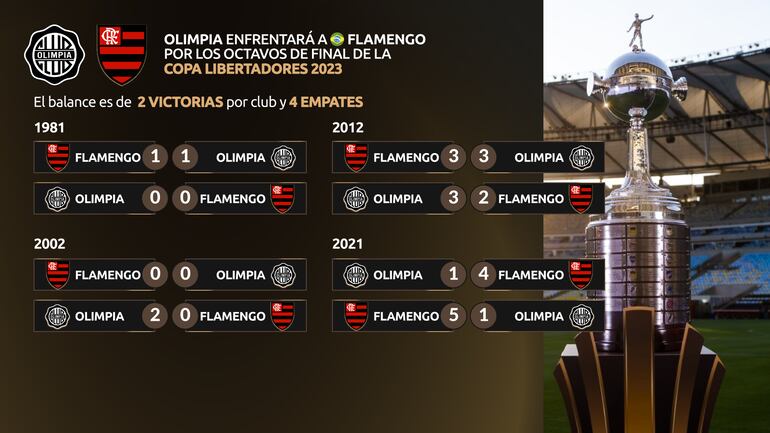 Paraguayos y brasileños, ganadores del torneo continental, volverán a jugar después de dos años. En 2021, el “Fla” había goleado 4-1 (Para Uno) y 5-1 (Mané Garrincha) y avanzó a las semifinales. Con el último antecedente, son 6 enfrentamientos, con 2 victorias para cada uno y 4 empates. Los dos triunfos del Rey de Copas fueron de local, en 2022 y en 2012.