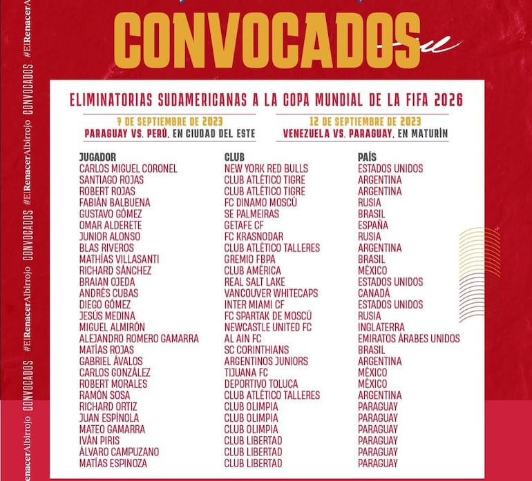 Hace una semana el técnico Guillermo Barros Schelotto había revelado a los elegidos del fútbol internacional: entre los 21 futbolistas, la novedad fue el arquero brasileño naturalizado paraguayo Carlos Miguel Coronel. Por su lado, las ausencias fueron de Adam Bareiro, el goleador de San Lorenzo de Almagro, y Antonio Sanabria, de gran temporada 2022-2023 en Italia.