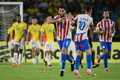 Los jugadores de la selección de Paraguay celebran un gol en el partido frente a Colombia por la fecha 14 de las Eliminatorias Sudamericanas 2026 en el estadio Metropolitano, en Barranquilla, Colombia.
