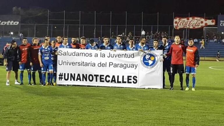 “Saludamos a la juventud universitaria del paraguay. #UNAnotecalles”, dictaba la pancarta que exhibieron los futbolistas momentos antes de iniciar el partido ante Rubio Ñu, en el inicio de la decimotercera jornada del torneo Clausura.