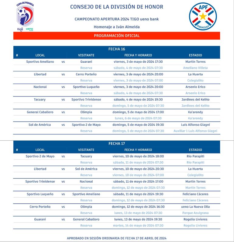 Además del partido más importante del país, el Ciclón y el Decano conocen el fixture en la décima sexta: El Azulgrana, actualmente escolta a 5 puntos de la cima, visitará al puntero Libertad el viernes 3 de mayo, a las 20:00, en La Huerta, mientras que el Franjeado medirá a General Caballero de Juan León Mallorquín el domingo 5, a las 17:00, en el estadio Ka’arendy.