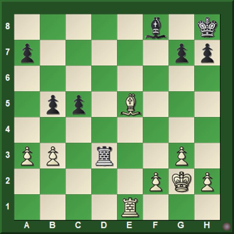 Luego de 32...Rg8 33.Te3 Txe3 34.fxe3 Rf7 35.Rf3 el pronóstico es de tablas, “pero cayó en el error que comento. No se asombren, los ha habido peores” (Najdorf). 32...Txb3?? 33.Ad6! [Gana una pieza y la partida.] 33...c4 [Claro que pierden 33...Axd6 34.Te8+ y 33...Rg8 34.Te8.] 34.Te8 h6 35.Txf8+ Rh7 36.Ta8 Td3 37.Ab4 Td7 38.Tb8 a6 39.Ta8 Tc7 40.Ac3 Tc6 41.Ta7 Rg6 42.g4 Rg5 43.Rg3 1–0
