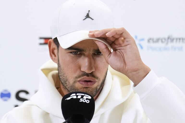 “Es raro y difícil sentarme aquí por segunda vez para comunicar que no voy a poder seguir en el torneo”, anunció Carlos Alcaraz en una breve comparecencia desde la sala de prensa del RCT Barcelona-1899.