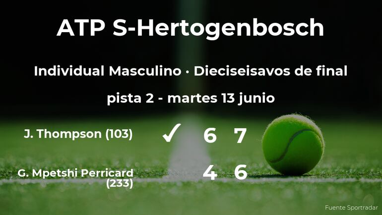 El tenista australiano Jordan Thompson, número 103 de la ATP, cumplió las previsiones al vencer en los dieciseisavos de final del torneo ATP 250 de 's-Hertogenbosch por 6-4 y 7(7)-6(3) en una hora y cuarenta y un minutos a Giovanni Mpetshi Perricard, tenista francés, número 233 de la ATP. Con este resultado, el ganador estará en los octavos de final del torneo ATP 250 de 's-Hertogenbosch.