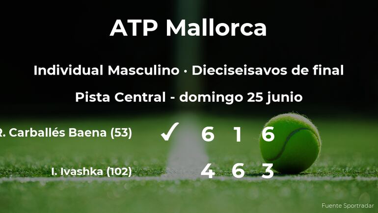 Roberto Carballés Baena, español, número 53 de la ATP y cabeza de serie número 8, sorprendió al vencer en los dieciseisavos de final del torneo ATP 250 de Mallorca por 6-4, 1-6 y 6-3 en dieciocho horas y cuarenta y un minutos a Ilya Ivashka, número 102 de la ATP. Con este resultado, seguiremos viendo al vencedor del partido en los octavos de final del torneo ATP 250 de Mallorca.