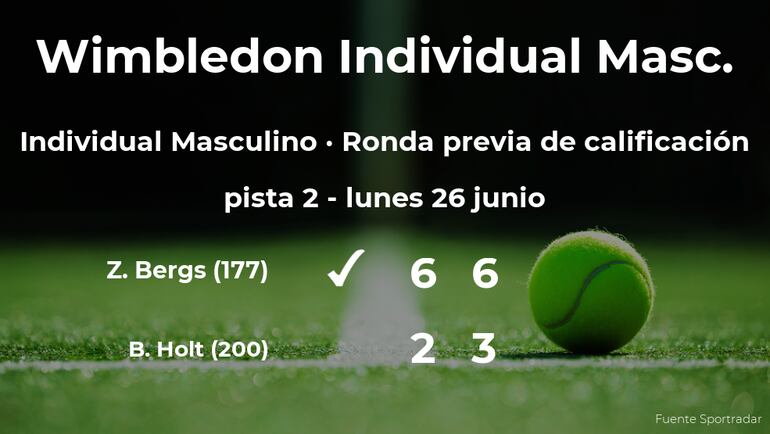 Zizou Bergs, belga, número 177 de la ATP, cumplió los pronósticos al ganar en la ronda previa de calificación de Wimbledon por 6-2 y 6-3 al tenista estadounidense Brandon Holt, número 200 de la ATP. Tras este resultado, el ganador consigue sumar nuevos puntos a su ranking para poder acceder al Campeonato de Wimbledon.
