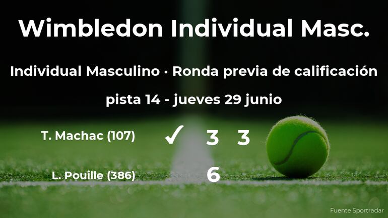 Tomas Machac, checo, número 107 de la ATP, ganó cuando el marcador mostraba un 3-6 y 3- debido a que su oponente, Lucas Pouille, tenista francés, número 386 de la ATP, se tuvo que retirar en la ronda previa de calificación de Wimbledon. Con este resultado, seguiremos viendo al jugador en la siguiente fase de Wimbledon.