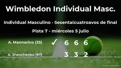 Adrian Mannarino, francés, número 35 de la ATP, cumplió los pronósticos al ganar por 6-3, 6-3 y 6-2 en una hora y treinta y cuatro minutos a Alexander Shevchenko, número 97 de la ATP, en los sesentaicuatroavos de final de Wimbledon. Tras este resultado, Mannarino se hace con la plaza para los treintaidosavos de final de Wimbledon.