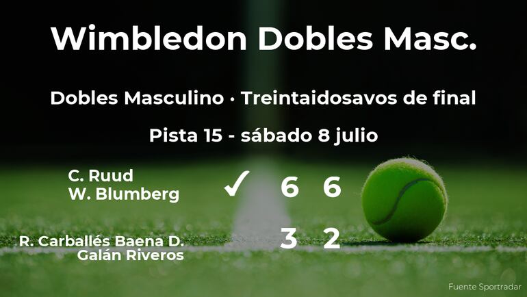 El tenista noruego Casper Ruud y el estadounidense William Blumberg, número 84 de la ATP cumplieron las previsiones al ganar por 6-3 y 6-2 al jugador español Roberto Carballés Baena y al colombiano Daniel Elahi Galán Riveros en los treintaidosavos de final de Wimbledon. Tras este resultado, los tenistas logran clasificarse para los dieciseisavos de final de Wimbledon.