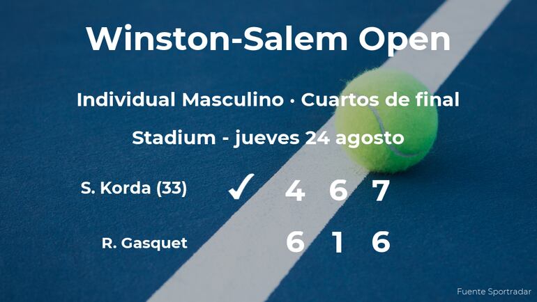Sebastian Korda, estadounidense, número 33 de la ATP y cabeza de serie número 3, ganó en los cuartos de final del torneo de Winston-Salem por 4-6, 6-1 y 7(9)-6(7) a Richard Gasquet, tenista francés y cabeza de serie número 12. Con este resultado, el tenista estará en la siguiente ronda del torneo de Winston-Salem.