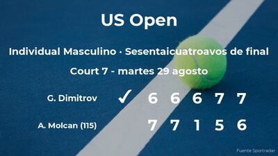 Grigor Dimitrov, y cabeza de serie número 19, venció en los sesentaicuatroavos de final del torneo de Nueva York por 6-7(11), 6(5)-7(7), 6-1, 7-5 y 7-6 al jugador eslovaco Alex Molcan, número 115 de la ATP. Tras este resultado, seguiremos de cerca la trayectoria del jugador en los treintaidosavos de final del torneo.