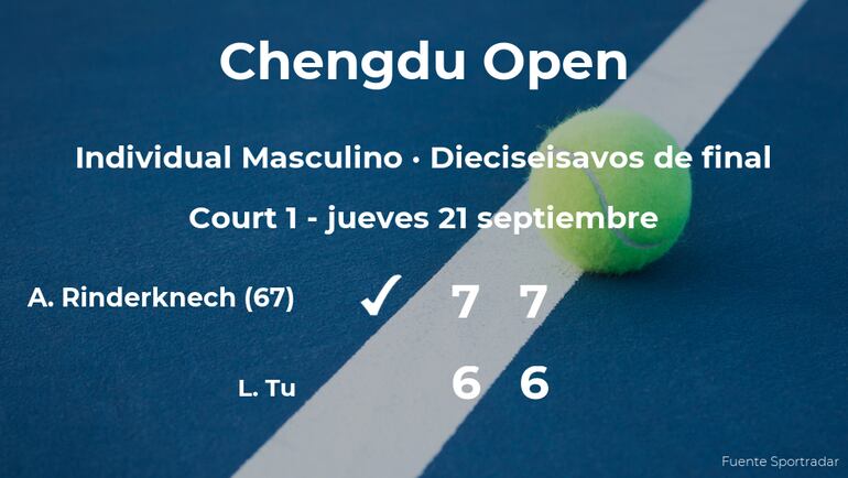 Arthur Rinderknech, francés, número 67 de la ATP, venció en los dieciseisavos de final del torneo de Chengdu por 7-6(5) y 7(8)-6(6) al tenista australiano Li Tu. Con este resultado, el tenista logra clasificarse para los octavos de final del torneo de Chengdu.