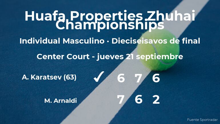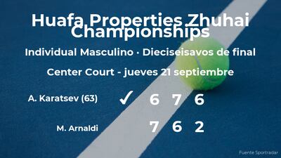 Aslan Karatsev, ruso, número 63 de la ATP, venció por 6-7(7), 7(7)-6(5) y 6-2 al italiano Matteo Arnaldi en los dieciseisavos de final del torneo de Zhuhai. Tras este resultado, seguiremos de cerca la trayectoria del jugador en los octavos de final del torneo.