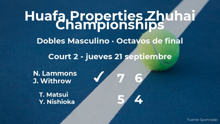 Los jugadores estadounidenses Nathaniel Lammons y Jackson Withrow ganaron en los octavos de final del torneo de Zhuhai por 7-5 y 6-4 a los japoneses Toshihide Matsui y Yoshihito Nishioka, y, número 46 de la ATP respectivamente. Con este resultado, veremos a los ganadores de este partido durante los cuartos de final del torneo de Zhuhai.