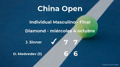 Jannik Sinner, italiano y cabeza de serie número 6, ganó por 7-6(2) y 7(7)-6(2) al jugador ruso Daniil Medvedev, número 3 de la ATP y cabeza de serie número 2, en la final del torneo de Pekín. Con este resultado, el italiano se convierte en el nuevo campeón del torneo de Pekín.