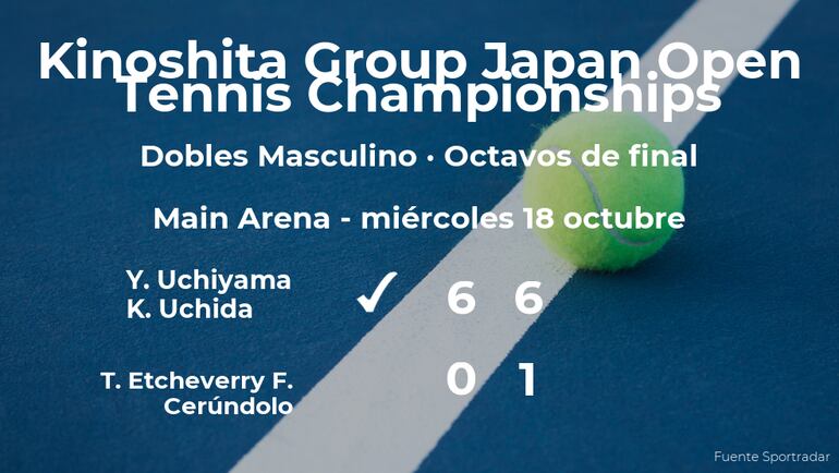 Los japoneses Yasutaka Uchiyama y Kaichi Uchida, número 0 de la ATP y, número 271 de la ATP respectivamente ganaron por 6-0 y 6-1 a los jugadores argentinos Tomás Etcheverry y Francisco Cerúndolo, número 31 de la ATP y, número 22 de la ATP respectivamente en los octavos de final del torneo de Tokio. Con este resultado, los ganadores estarán en la siguiente ronda del torneo de Tokio.