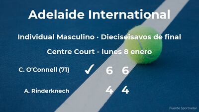 Christopher O'Connell, australiano, número 71 de la ATP, ganó por 6-4 y 6-4 a Arthur Rinderknech, tenista francés en los dieciseisavos de final del torneo de Adelaida. Tras este resultado, el ganador estará en los octavos de final del torneo de Adelaida.