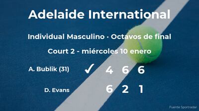 El tenista kazajo Alexander Bublik, número 31 de la ATP y cabeza de serie número 8, venció por 4-6, 6-2 y 6-1 a Daniel Evans, tenista británico en los octavos de final del torneo de Adelaida. Tras este resultado, podremos seguir viendo al ganador del partido en la siguiente fase del torneo de Adelaida.