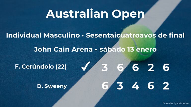 Francisco Cerúndolo, argentino, número 22 de la ATP y cabeza de serie número 22, venció por 3-6, 6-3, 6-4, 2-6 y 6-2 a Dane Sweeny, tenista australiano en los sesentaicuatroavos de final del torneo de Melbourne. Con este resultado, el jugador argentino logra clasificarse para los treintaidosavos de final del torneo de Melbourne.