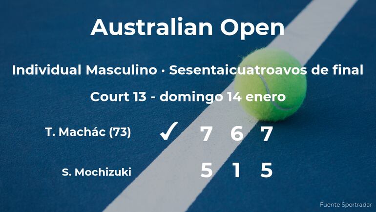 Tomáš Machác, checo, número 73 de la ATP, venció por 7-5, 6-1 y 7-5 al jugador japonés Shintaro Mochizuki en los sesentaicuatroavos de final del torneo de Melbourne. Tras este resultado, podremos seguir viendo al ganador del partido en la siguiente fase del torneo de Melbourne, los treintaidosavos de final.