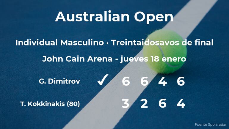 Grigor Dimitrov y cabeza de serie número 13, ganó por 6-3, 6-2, 4-6 y 6-4 a Thanasi Kokkinakis, tenista australiano, número 80 de la ATP, en los treintaidosavos de final del torneo de Melbourne. Tras este resultado, veremos al vencedor del partido en los dieciseisavos de final del torneo de Melbourne.