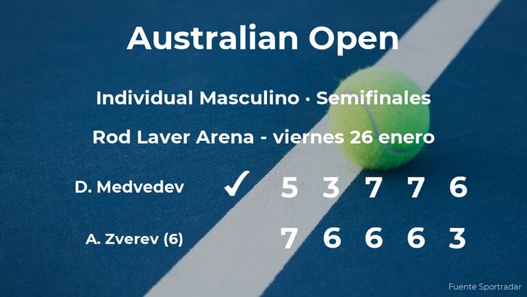 Daniil Medvedev, ruso y cabeza de serie número 3, ganó en las semifinales del torneo de Melbourne por 5-7, 3-6, 7(7)-6(4), 7(7)-6(5) y 6-3 a Alexander Zverev, tenista, número 6 de la ATP y cabeza de serie número 6. Tras este resultado, podremos seguir viendo al vencedor del partido en la siguiente ronda del torneo de Melbourne.