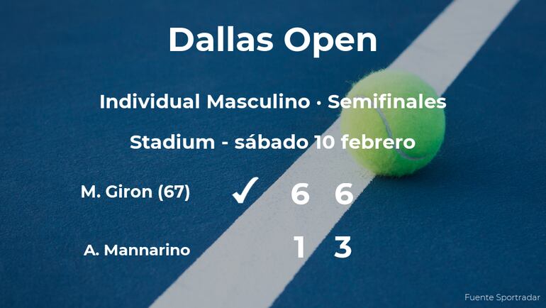 El jugador estadounidense Marcos Giron, número 67 de la ATP, venció por 6-1 y 6-3 a Adrian Mannarino, tenista francés y cabeza de serie número 4, en las semifinales del torneo de Dallas. Tras este resultado, el jugador consigue la plaza para la siguiente fase del torneo de Dallas.