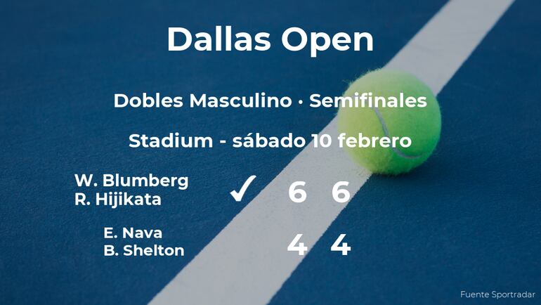 El estadounidense William Blumberg y el tenista australiano Rinky Hijikata, número 88 de la ATP vencieron en las semifinales del torneo de Dallas por 6-4 y 6-4 a los jugadores estadounidenses Emilio Nava y Ben Shelton, número 149 de la ATP y, número 16 de la ATP respectivamente. Tras este resultado, seguiremos viendo a los vencedores de este partido durante la siguiente fase del torneo de Dallas.