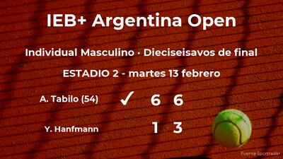 Alejandro Tabilo, número 54 de la ATP, venció en los dieciseisavos de final del torneo de Buenos Aires por 6-1 y 6-3 a Yannick Hanfmann, tenista. Con este resultado, seguiremos viendo al vencedor del partido en la siguiente fase del torneo de Buenos Aires, los octavos de final.