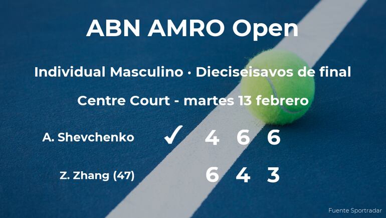 El tenista kazajo Alexander Shevchenko venció por 4-6, 6-4 y 6-3 a Zhizhen Zhang, tenista chino, número 47 de la ATP, en los dieciseisavos de final del torneo de Rotterdam. Con este resultado, veremos al ganador del partido en los octavos de final del torneo de Rotterdam.