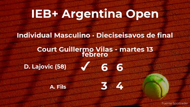 El jugador serbio Dušan Lajovic, número 58 de la ATP, ganó en los dieciseisavos de final del torneo de Buenos Aires por 6-3 y 6-4 a Arthur Fils, tenista francés y cabeza de serie número 8. Con este resultado, podremos seguir viendo al vencedor del partido en los octavos de final del torneo de Buenos Aires.