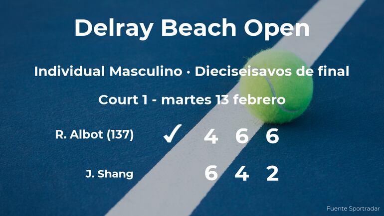 Radu Albot, moldavo, número 137 de la ATP, ganó en los dieciseisavos de final del torneo de Delray Beach por 4-6, 6-4 y 6-2 al tenista chino Juncheng Shang. Tras este resultado, podremos seguir viendo al vencedor del partido en los octavos de final del torneo de Delray Beach.