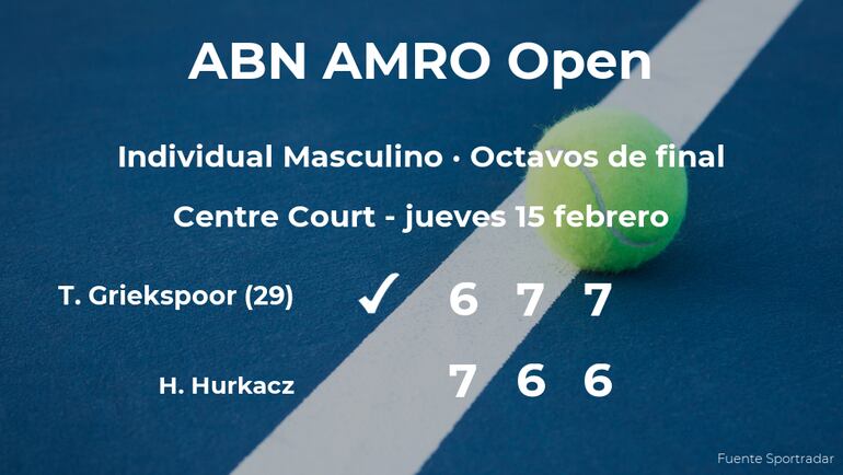 Tallon Griekspoor,, número 29 de la ATP, ganó por 6(5)-7(7), 7(7)-6(5) y 7(7)-6(4) a Hubert Hurkacz, tenista polaco y cabeza de serie número 4, en los octavos de final del torneo de Rotterdam. Con este resultado, Griekspoor estará en la siguiente fase del torneo de Rotterdam.