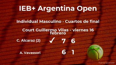 El jugador español Carlos Alcaraz, número 2 de la ATP y cabeza de serie número 1, ganó en los cuartos de final del torneo de Buenos Aires por 7(7)-6(1) y 6-1 a Andrea Vavassori, tenista italiano. Tras este resultado, podremos seguir viendo al ganador del partido en la siguiente fase del torneo de Buenos Aires.