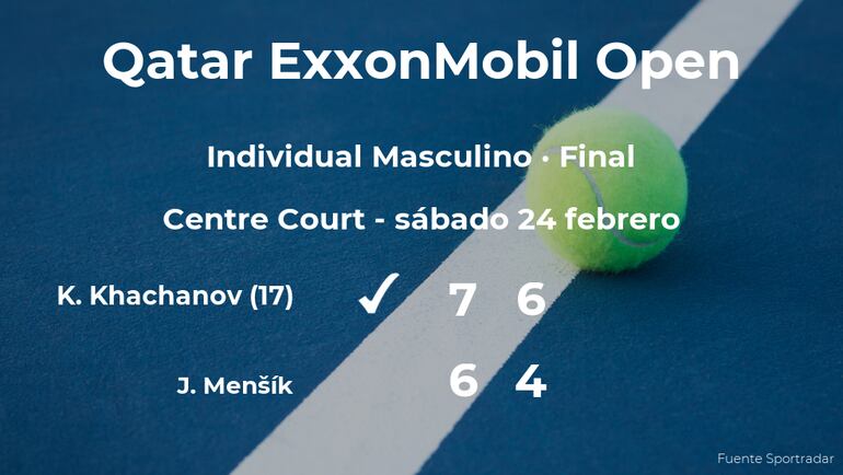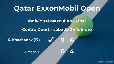 El tenista ruso Karen Khachanov, número 17 de la ATP y cabeza de serie número 2, ganó por 7(14)-6(12) y 6-4 a Jakub Menšík, tenista checo en la final del torneo de Doha. Tras este resultado, Khachanov es el nuevo campeón del torneo de Doha.